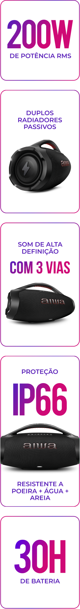O resultado? Uma experiência sonora com a pureza do DNA japonês AIWA®! Garantia de vocais claros e nitidez nos detalhes, assegurando um som perfeito e sem distorções.