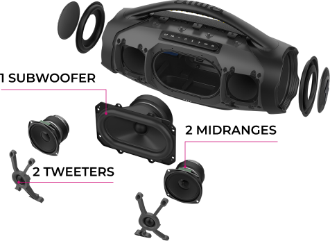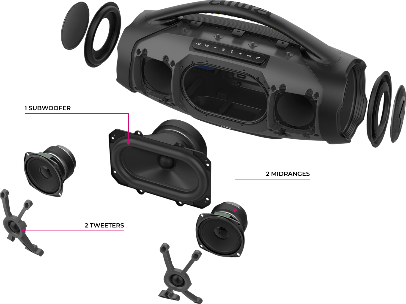 A Boombox conta com dois radiadores passivos laterais, que atuam em conjunto com os alto-falantes para aprimorar a propagação do som.