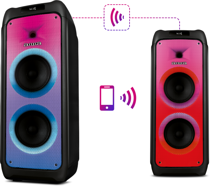 Amplie o som da sua festa com a função TWS (True Wireless Sound). Basta conectar duas PartyBoxes AWS-PB-06 e elevar a potência sonora. Impressionante, não é mesmo?