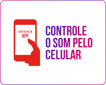 Baixe o APLICATIVO AIWA BRASIL pela Google Play ou pela APP Store, da Apple, e comande a equalização do som (graves, médios e agudos) e as luzes pelo celular.